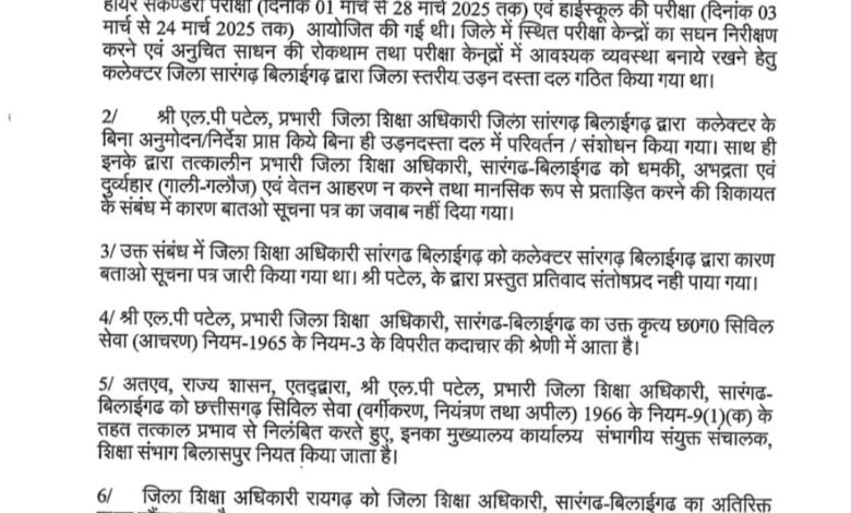 छत्तीसगढ़ सरकार ने सारंगढ़-बिलाईगढ़ के प्रभारी जिला शिक्षा अधिकारी एलपी पटेल को तत्काल प्रभाव से निलंबित कर दिया है। पटेल पर कई गंभीर आरोप लगे हैं। पटेल ने मार्च में आयोजित हाई स्कूल और हायर सेकेंडरी बोर्ड परीक्षाओं के दौरान अनुचित काम किए।