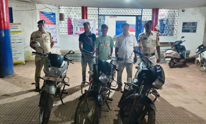 सारंगढ़ खबर न्यूज,सारंगढ़——पुलिस अधीक्षक आंजनेय वार्ष्णेय,अति0 पुलिस अधीक्षक श्रीमती निमीषा पाण्डेय एवं एसडीओपी श्रीमति स्नेहिल साहू के द्वारा जुआ, सट्टा के अपराधो पर रोकथाम हेतु लगातार निर्देशित किये जाने पर सारंगढ़ के पुलिस स्टाफ के द्वारा जुआ के विरुद्ध कार्यवाही की गई।अप0क्रं0- 364/2025 धारा- 3(2) छ0ग0 जुआ प्रति0 अधिनियम 2022- प्रकरण में घटना दिनांक- 28.07.2025 को जरिये मुखबिर सूचना मिला कि ग्राम उलखर के तालाब पार के पास कुछ जुआडीयान रूपये पैसा का दांव लगाकर जुआ खेलने कि सूचना पर हमराह स्टाफ एवं गवाहान के घटना स्थल जाकर रेड़ कार्यवाही किया, जहां पर जुआडियान- (1) टकेश्वर चंद्रा पिता सम्मेलाल चंद्रा उम्र 45 वर्ष सा0 उलखर (2) साहिल महंत पिता कार्तिक महंत उम्र 35 वर्ष सा0 उलखर (3) सुरेश भारती पिता बिसाहू भारती उम्र 35 वर्ष सा0 उलखर को पकड़ा गया, जिसके कब्जे से नगदी रकम 1300 रू0 एवं 03 नग मोटर सायकल- हीरो फैशन प्रो काला सिल्वर क्रमांक-सीजी-13जे-5861, हीरो स्प्लेंडर प्लस काला रंग क्रमांक- सीजी-13एव्ही-2243, एचएफ डिलक्स काला सिल्वर रंग क्रमांक-सीजी-13एएम-2815 जुमाल रकम करीबन 1,26,300 रूपये कों जप्त कर कब्जा पुलिस लिया गया बाद आरोपियों को गिरफ्तार कर विधिवत कार्यवाही की गई ।