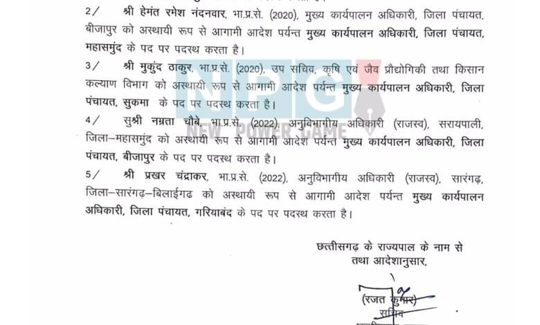 3. मुकुंद ठाकुर (2020 बैच), उप सचिव कृषि एवं जैव प्रौद्योगिकी विभाग, को जिला पंचायत सुकमा के सीईओ की जिम्मेदारी सौंपी गई है।
