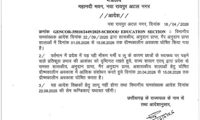 2/ वर्तमान में प्रदेश में पड़ रही भीषण गर्मी व लू के कारण छात्रों के स्वास्थ्य पर पड़ने वाले प्रतिकूल प्रभाव की आशंका को दृष्टिगत रखते हुये, राज्य शासन एतद् द्वारा प्रदेश के समस्त शासकीय, अनुदान प्राप्त, गैर अनुदान प्राप्त, अशासकीय शालाओं हेतु घोषित ग्रीष्मकालीन अवकाश में आंशिक संशोधन करते हुये दिनांक 20.04.2026 से 15.06.2026 तक ग्रीष्मकालीन अवकाश घोषित करता है।